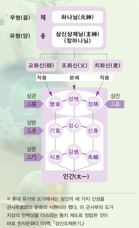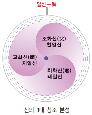 ’이라 하였으며, 이 삼신과 ‘하나’가 되어 천상 보좌에서 우주 질서와 인간 역사를 총체적으로 다스리는,
