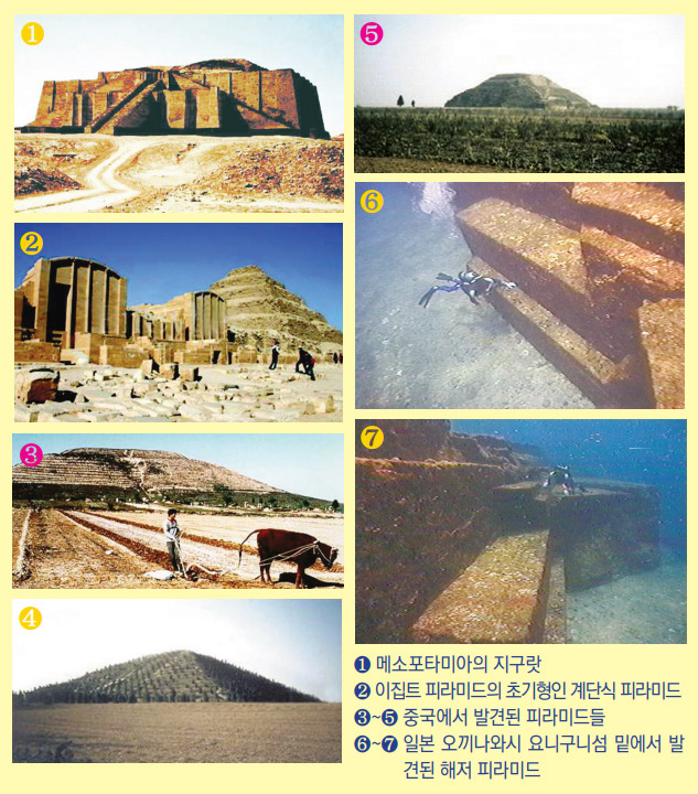 가 되었다. 이집트인들은 피라미드를 ‘승천의 공간’을 뜻하는 ‘메르mer’라 불렀는데 지구라트란 말도 ‘높이 상승하는 것’을 의미한다. 이외에도 만주, 중국 시안西安, 티베트 등지에도 이집트보다 훨씬 많고 웅장한 피라미드가 널려 있음이, 약 70여 년 전 중국 시안 지역을 비행하던 미 공군 조종사에 의해 처음 밝혀졌다.*2)