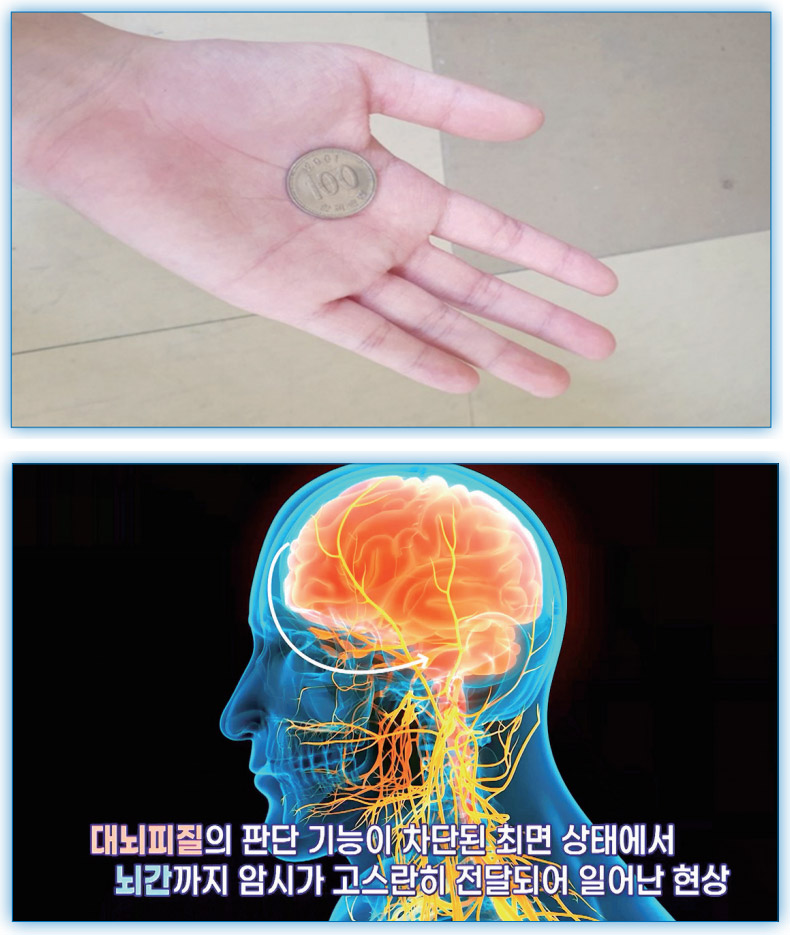 깊은 최면 상태에서 ‘손바닥에 뜨거운 동전을 올려놓는다.’는 암시를 주고 100원짜리 동전을 올려놓으면 피험자의 손바닥에 화상이 생깁니다. 대뇌피질의 판단 기능이 차단된 최면 상태에서, 뭐든 100% 믿는 뇌간까지 암시가 고스란히 전달되어 일어난 현상이죠.