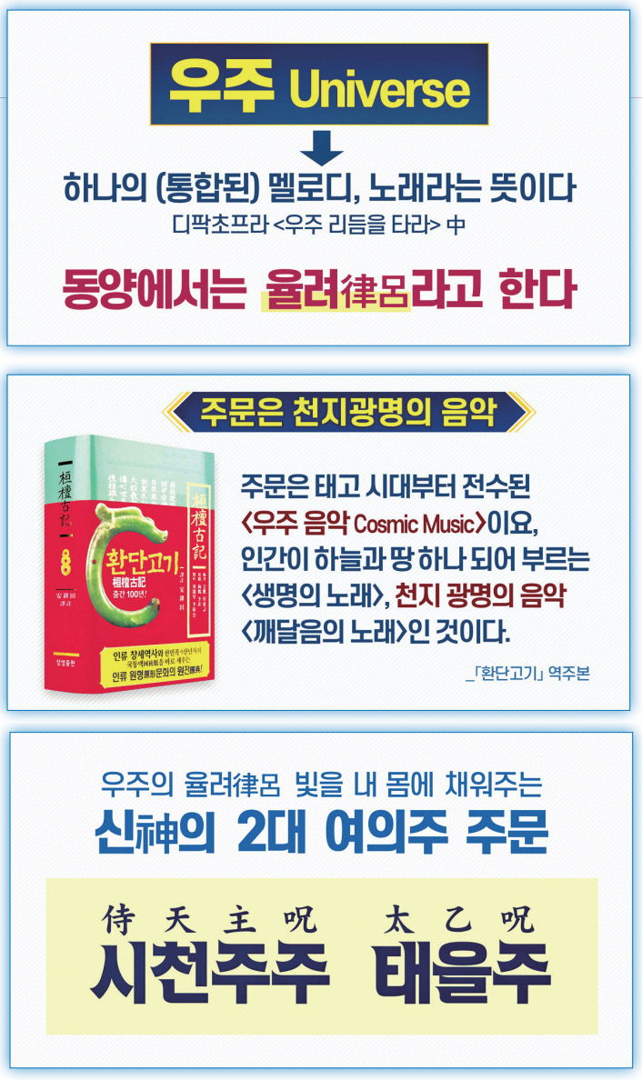 우주가 뿜어내는 특별한 멜로디, 율려에 공명하여 우주와 내가 하나 되도록 하는 가이드가 바로 만트라mantra, 주문呪文입니다. 태고 시절부터 전수된 천지 광명의 우주 음악, 인간이 하늘땅과 하나 되어 부르는 생명의 노래죠.