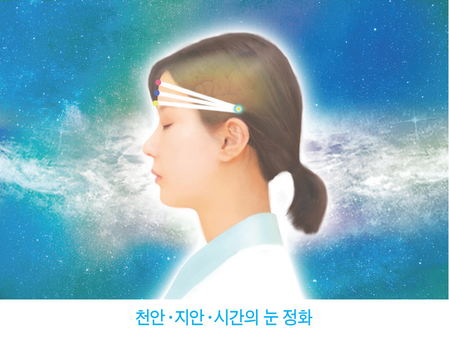 내 몸 개인 삼신의 눈이 우주의 절대 근원인 조물주 빛의 삼신과 소통을 합니다. 이게 도통道通이에요. 소통을 완벽하게 하면 대광명 속에서 이 지구도, 우주도 눈 감고 다 볼 수 있습니다. 자기가 공부한 만큼, 정성으로 사무치게 수행한 만큼 이 눈이 열립니다. 이 눈을 전문적으로 여는 단계별 공부가 있습니다. 지금 1차 기본 수행을 하고, 2차에 가서 조금 더 하고, 여의주를 받아 단계별로 이 눈을 정화하면서 열어 나가는 수행이 있어요.