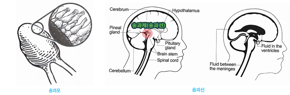 상단에는 두개골 두 개가 맞닿은 경계선 아래 옴폭 들어간 그 경계에 밥알만 한 송과선松果腺이 있습니다. 이 송과선은 태허령님의 무궁한 신의 세계에 들어가는 관문이에요. 거기에 미세한 털이 숱하게 붙어 있는데 주문을 읽으면 그 섬모들이 물결치면서 온 우주가 열립니다. 천상 신의 세계에 들어가는 빛의 터널이 열린단 말입니다. 나중에 직접 보면 얼마나 재미있겠어요.