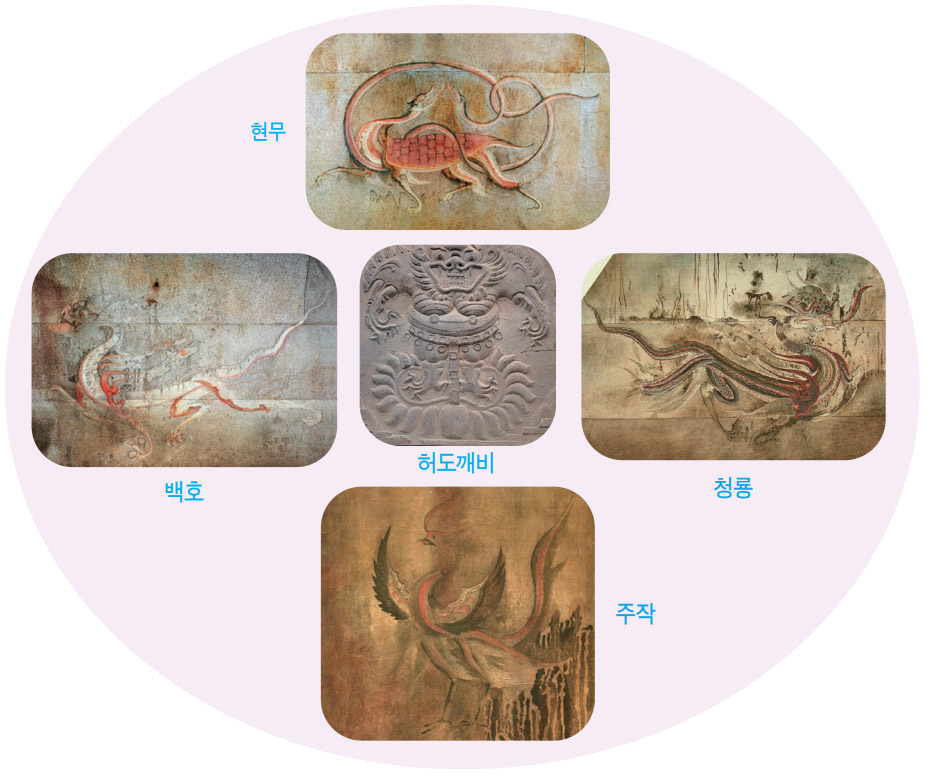 이 두 공부가 합쳐져서 가슴의 명단에 수명 줄을 강화하고 강건하게 신선 몸을 만드는 시스템을 짜는 것입니다. 그 시스템은 2차 수행에서 동서남북 중앙을 지키는 청룡, 백호, 주작, 현무 그리고 중앙에 정말로 놀랍고 신비스러운 허도깨비라는 토신土神을 모시는 것입니다.