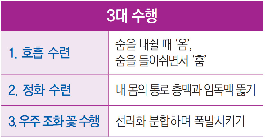 우리가 영원히 해야 할 3대 기본 수행이 있습니다. 이 기본 수행은 우리가 언제 어디에서든 해야 할 수행이에요. 그것은 호흡 수련, 정화 수련 그리고 우주 조화 꽃 수행입니다.