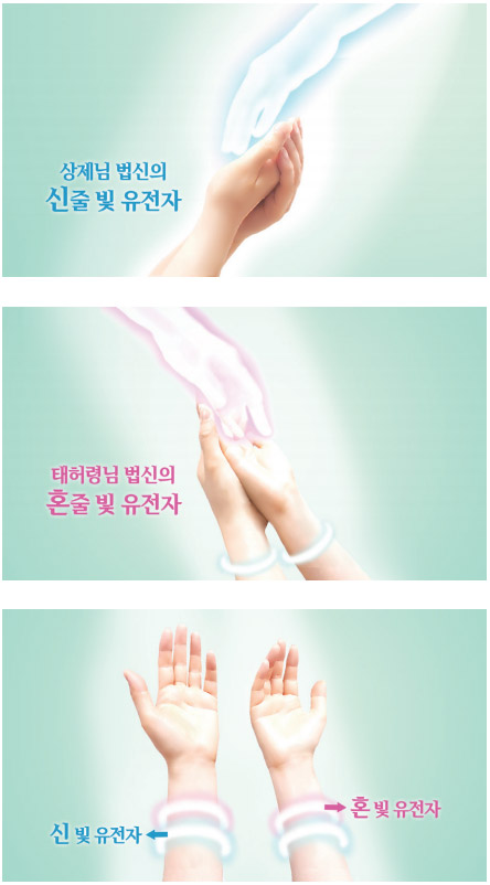 이 빛 유전자라는 것은 무엇일까요? 상제님은 이렇게 말씀하셨습니다. “내가 나의 세포 하나를 떼서 줄 테니까 네 몸에다 심어 봐라. 조화가 무궁무진하단다. 얼마나 좋은 일이냐.” 빛 유전자를 세포에 비유하여 말씀하신 것입니다. 최근에는 “내가 빛의 유전자를 직접 통으로 내려 줄 테니까 이것을 손목에다 감아라.”라고 하셨습니다.
