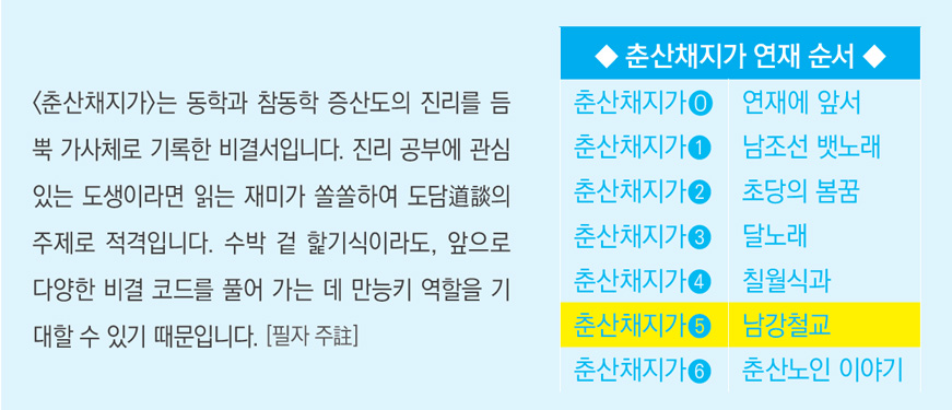 ‘쥐구멍에도 볕 들 날 있다.’는 속담이 비유적 표현이 아니라 실제로 천지의 방위가 바뀌면서 현실화될 수 있다는 겁니다. 그래서 이 춘산채지가의 가치는, 그동안 우리나라에 전해 오던 선천先天 비결과는 전혀 차원을 달리하는 후천 비결서의 머리가 됩니다. 너무나 쉬운 노랫말처럼 되어 있지만 지식이 아무리 많아도 풀 수 있는 문서가 아닙니다.