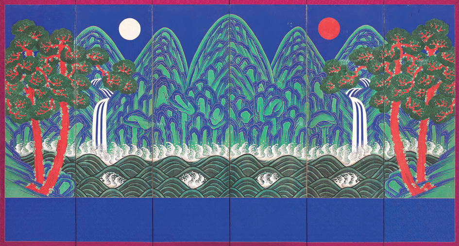 일월오봉도日月五峯圖 - 음양을 상징하는 일월과 오행을 상징하는 다섯 봉우리 그리고 물과 소나무가 그려져 있으며, 임금이 임하는 장소라면 어느 곳이나 어좌御座 배경에 설치되었다. 오직 조선에서만 제작된 그림이다.(국립고궁박물관)