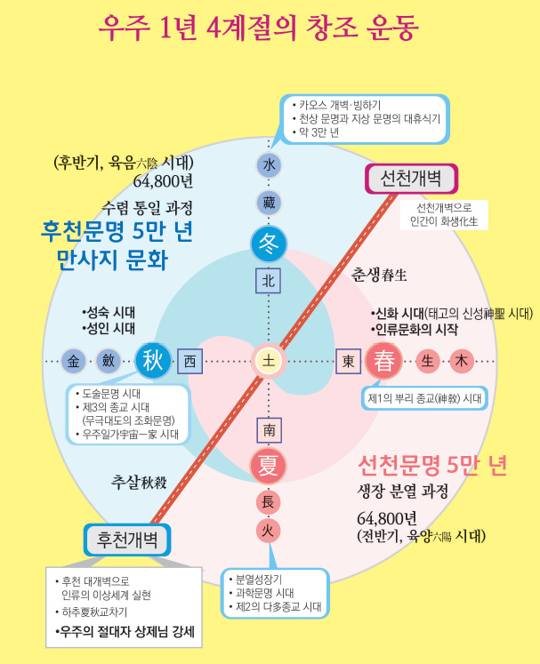 우주 1년 4계절은 대우주가 지구를 중심으로 천지의 주인공인 인간 농사를 짓는 시간의 큰 주기이다. 이제 가을이 되면 우주는 선천 봄여름 철에 낳아서 길러온 다양한 문화를 성숙한 하나의 문화권으로 통일, 결실하여 참된 인간 열매, 즉 참인간 종자를 추수한다.