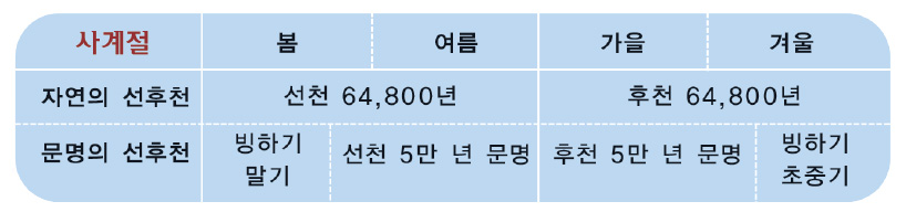 은 봄에서 여름까지 선천 5만 년, 가을에서 겨울 초까지 후천 5만 년, 모두 10만 년이다. 나머지 약 3만 년은 인간과 일체 생물이 지구상에 살 수 없는 기나긴 빙하기이다.