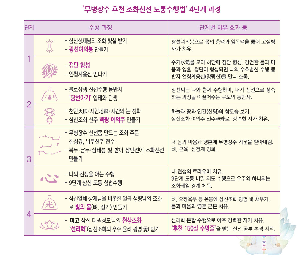 원래 무병장수 조화신선 도통 수행법의 원형은 본래 2만 5천 년 전 마고성麻姑城에서 비롯되어 환국-배달-조선-북부여-고구려 등 한국의 국통맥을 계승한 제왕들에게 비전되어 내려왔다.