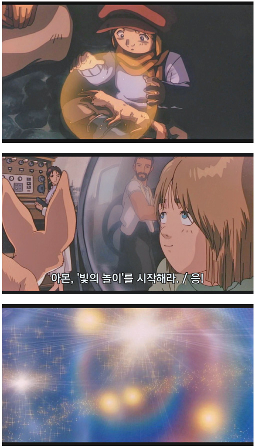 이 영화에서 소년 아몬이 밤하늘의 바람 속에서 본 빛 알갱이들이 그걸 표현한 것처럼 느껴졌다. 그런데 이 영화가 우연히 이런 세계관을 가져온 것이 아니라는 것을 알 수 있는 단서가 바로 다음 장면에 등장한다.