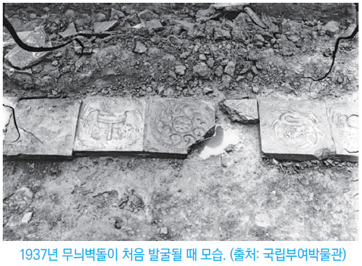 그러던 1937년 3월 9일, 백마강 건너편 산기슭에서 한 농부가 나무뿌리를 캐다가 우연히 무늬벽돌을 발견했다. 이에 조선총독부 산하 조선고적연구회에서는 아리미츠 쿄이치有光敎一를 보내 주변 지역을 발굴하게 하였다. 초석과 같은 흔적은 발견되지 않았지만 남북 약 9미터 길이에 약 30점의 무늬벽돌이 깔려 있는 것을 확인할 수 있었다. 바닥에 열을 지어 깔려 있던 벽돌들은 각각의 무늬들이 무질서하게 배열되어 있었다. 따라서 발굴 당시의 모습은 그것들이 처음 사용되었을 모습이 아니라 2차적으로 재이용된 것을 보여 주는 것으로 추정된다.