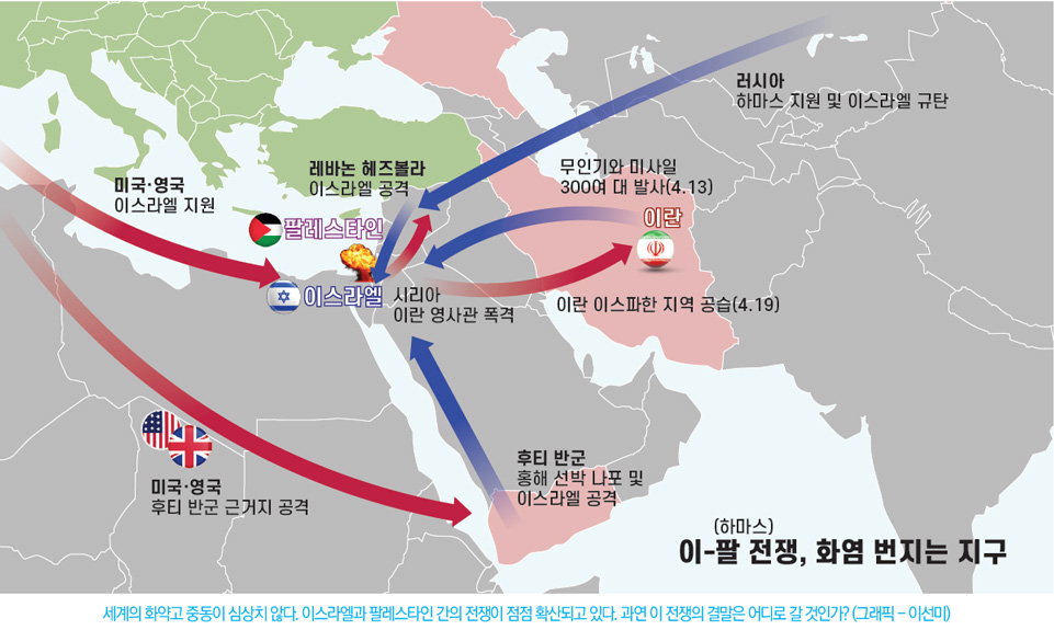 우크라이나 침공 뒤 이란산 드론으로 전쟁을 지속해 온 러시아도 이스라엘의 공습에 대해 “이번 공격은 민간인 피해 위험이 큰 대도시에서 발생했다는 점에서 절대 용납될 수 없다.”는 외무부 성명으로 대이스라엘 규탄에 동참했다. 이런 일련의 흐름 속에 이스라엘과 아랍권을 화해시키려는 미국의 중동 구상은 더욱 불투명해졌다. 악순환의 고리가 더 커지면서 중동의 전운이 고조되고 있다. ◎