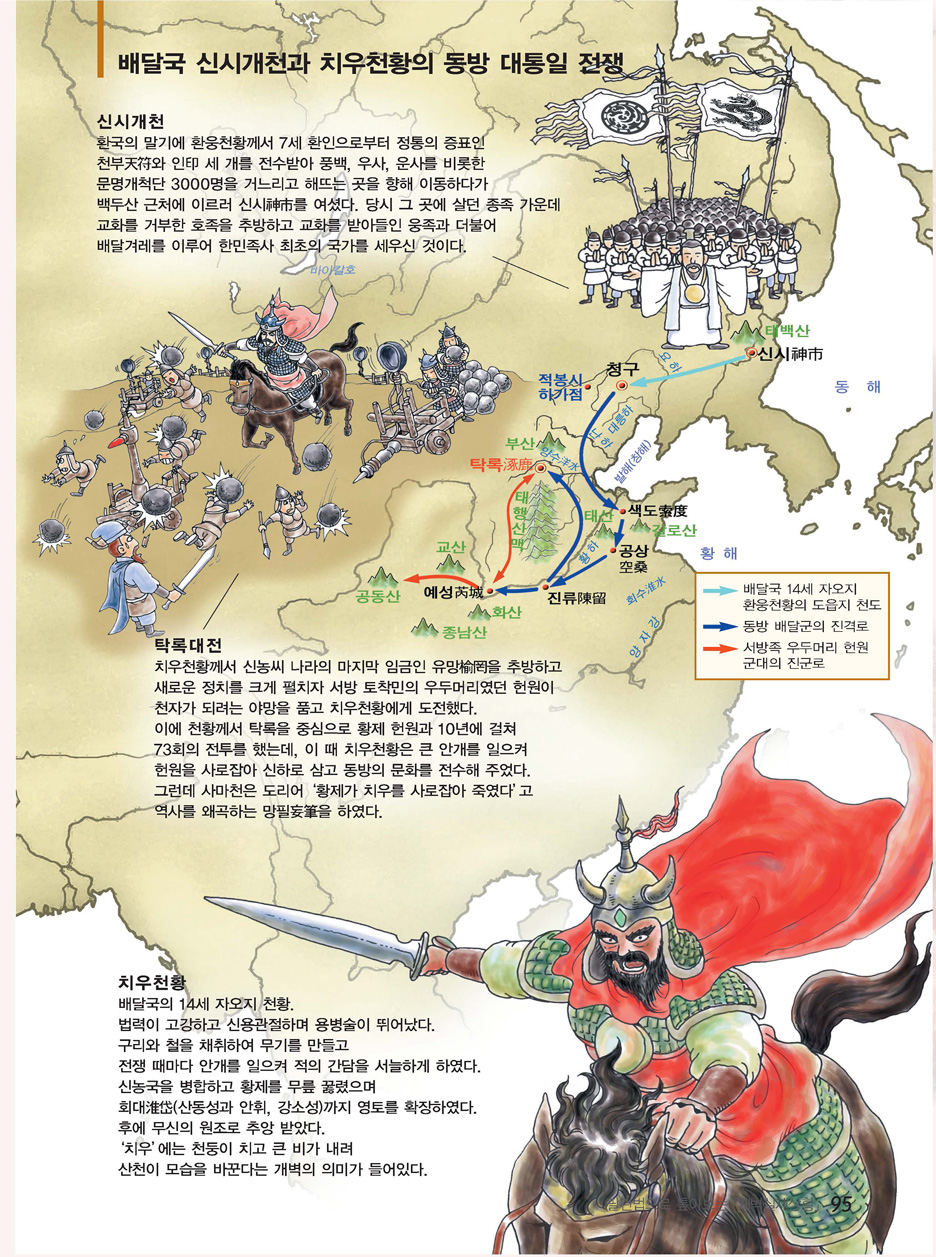 주었다. 특히 14세 자오지慈烏支 환웅은 일명 치우천황蚩尤天皇으로 불리는 탁록대전의 주인공이자 서방 한족에게 동방 신교와 천자 문화를 전해 준 대제왕이다.