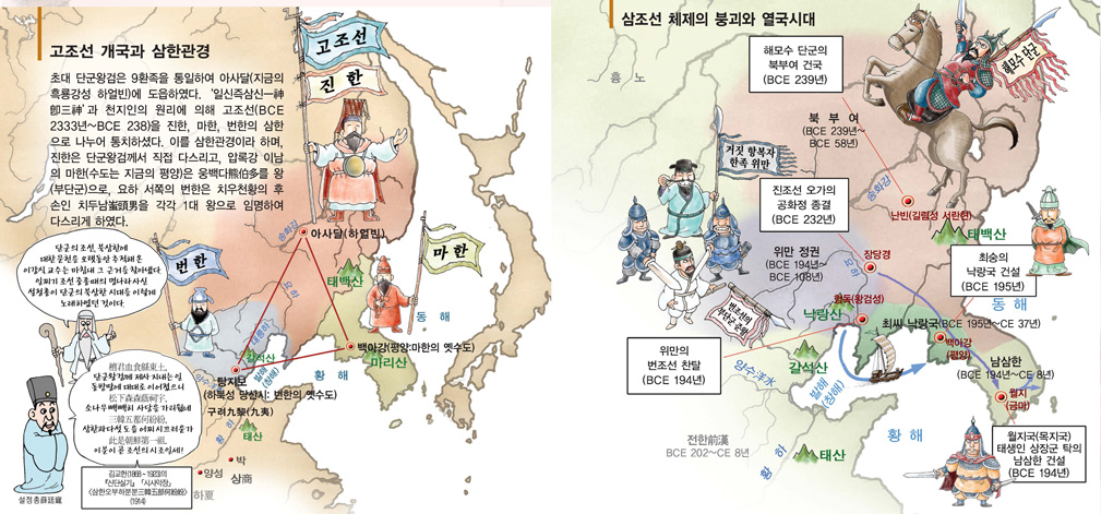 에서 비롯된다. 실제 위만은 단군조선의 왼쪽 팔(지금의 산둥반도 일대를 다스리던) 번조선의 준왕을 왕검성에서 쫓아내 위만 정권을 세운 인물이다. BCE 194년 이후 조선의 여러 유민이 해로를 통해 또는 도보로 대륙에서 반도로 역사 무대를 옮겨 왔다. 그런데 이 과정을 들여다보면 참으로 참담하다. 역사를 왜곡하고 제 뿌리를 잡아먹는 천고에 없는 불의와 패악으로 민족의 혼이 완전히 말살되고 소멸되어 버렸기 때문이다.