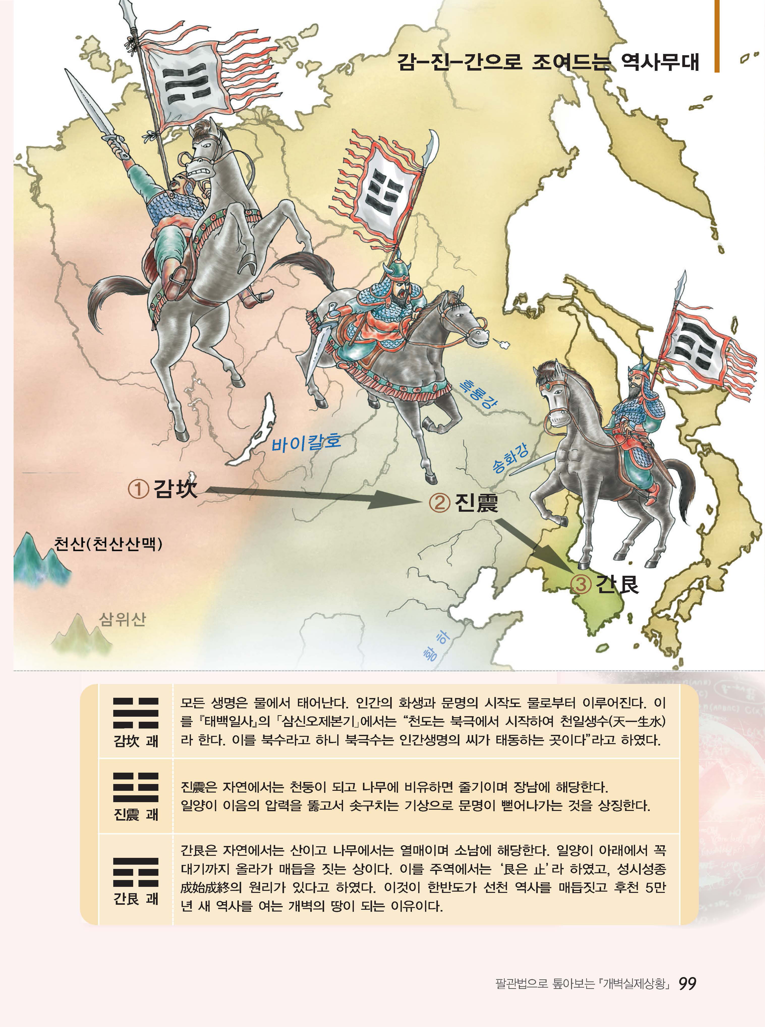 우주의 봄철 인간은 어디에서 태어났을까? 아프리카라는 말도 있지만, 실제로는 북녘의 감방坎方에 해당하는 바이칼 호수 인근이다. 바이칼 호수는 신비롭게도 모체의 양수羊水와 그 성분이 유사하다고 한다. 이곳에서 인간이 나왔고, 환국 이전 마고성麻姑城도 이곳에 있었다. 그 후 이들이 중앙아시아로 이동하여 남북 5만 리, 동서 2만 리에 퍼져 나갔고, 주된 세력은