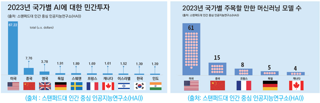 지난해 AI 분야에 가장 많은 투자를 한 국가와 AI 발전 측면에서 가장 큰 성과를 거둔 나라는 역시나 미국이었다. 미국 스탠퍼드대 인간 중심 인공지능연구소(HAI)가 발간한 「AI 인덱스 2024」에 따르면 지난해 미국의 민간 AI 투자액은 672억 달러(약 93조 9850억 원)로 집계돼 주요국 가운데 압도적 1위를 차지했다. 2위인 중국(약 77억 달러)의 8.7배에 달하는 액수다.