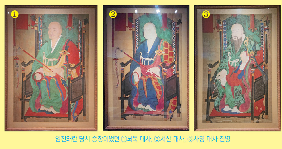 처영 스님이 의승군義僧軍 1,000여 명을 모집해 궐기한 이후 금산사는 의승군 활동의 중심지가 됐다. 이로 인해 정유재란 때 왜군이 보복으로 금산사에 불을 질러 모든 건물과 암자가 소실됐다고 한다. 이후 금산사는 불굴의 의지와 강한 실천력으로 미륵전과 미륵장륙상을 비롯하여 여러 건물을 다시 세워 대가람을 이루었다. 이번 전시에는 서산 대사西山大師 휴정休靜과 사명 대사四溟大師 유정惟政의 진영도 함께 볼 수 있다.