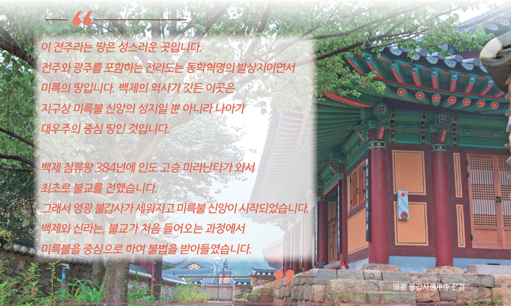 이곳 ‘전주全州’에서 온전 전全 자는 완전, 전일全一이라는 뜻이 있습니다. 전일은 모든 것이 하나 된 것인데, 현대의 영성 문화에서도 이 우주라는 존재를 ‘하나’라 말하고 있습니다. 이 전주라는 땅은 성스러운 곳입니다. 전주와 광주를 포함한 전라도는 동학혁명의 발상지이면서 미륵의 땅입니다. 백제의 역사가 깃든 이곳은 지구상 미륵불 신앙의 성지聖地일 뿐 아니라 나아가 대우주의 중심 땅인 것입니다.