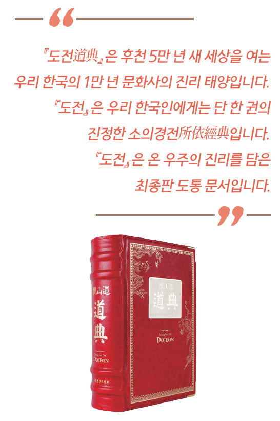지금 우리가 읽는 『도전』은 그 현장을 답사하여 오착誤錯과 잘못된 한자 등 많은 것을 최대한 바로잡은 것입니다. 『도전』은 선천 상극 세상이 끝나고 후천 5만 년 새 세상을 여는 우리 한국인의 1만 년 문화사에서 새로운 진리 태양이라 할 수 있습니다. 우리 한국인에게는 단 한 권의 진정한 소의경전所依經典인 것입니다. 물론 한 페이지짜리 「천부경天符經」도 있고, 동학의 『동경대전東經大全』도 있지만 그것은 사실 분량이 얼마 안 되는 거예요.