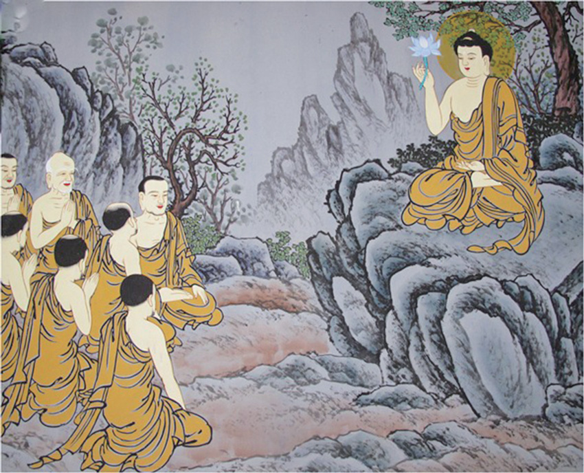 영산회상에서 마우링가 푸타가 석가 부처님의 말씀을 듣고 토론을 제의했을 때, 석가 부처님이 “너 잔소리하지 말고 내 밑에서 2년만 침묵 수행을 해라. 그러면 스스로 알게 된다.”라고 말했습니다. 푸타가 그렇게 하기로 약속하고 선물을 올렸습니다. 그 선물에는 꽃도 있었는데 아마 연꽃이었던 것 같습니다. 석가 부처님이 “야, 2년 기다릴 것도 없다. 여기서 답을 주마.” 하고 그 꽃 한 송이를 들고서 미소를 지었습니다. 그 답은 언어로 알 수 있는 게 아니라는 것입니다. 경전을 보고 아무리 뛰어난 해석을 한다 할지라도 그 세계를 알 수 있는 게 아니라는 거예요.