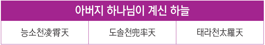 천상의 한 하늘을 세 가지 이름으로 불렀습니다. 능소천凌霄天, 도솔천兜率天 그리고 태라천太羅天입니다. 대우주에 동서남북으로 32개 천을 벌여 놓고, 그 중심에 있는 가장 높은 곳, 너무도 지존한 하늘을 태라천이라 했습니다. 여동빈呂洞賓 대신선이 ‘도솔능소천궁兜率凌霄天宮’이라 노래한 그곳이 바로 태라천입니다. 그곳은 상제님이 우주 정치를 행하시는 상제님의 하늘입니다. 그러니까 능소천, 도솔천, 태라천을 한 하늘, 같은 하늘로 아시면 됩니다.
