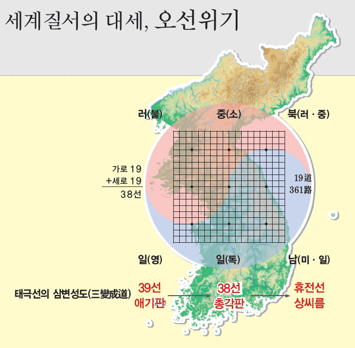전 세계의 4대 강국이, 상제님이 보신 천지공사 바둑판 도수에 따라 바둑을 두듯이 세계 정치의 권력 게임을 합니다. 그것이 일러전쟁, 중일전쟁 그리고 한반도 남북전쟁 세 판으로 승부가 나게 됩니다. 상제님은 이 바둑판 도수를 씨름판에 비유하셨습니다. 한반도의 남북 대결, 남북 상씨름은 곧 세계 상씨름입니다. 그래서 세계 질서가 전환하게 되는 남북통일의 전쟁이 오는 것입니다. 『도전』 5편에 그런 상제님 공사 내용이 많이 나오는데 특히 6장, 7장을 한번 잘 보세요.