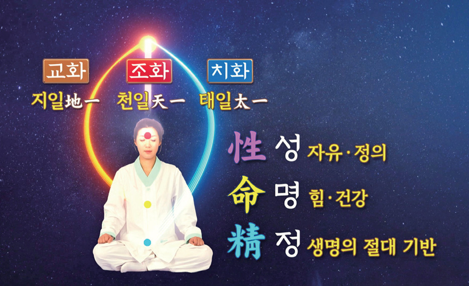 우주의 빛의 세계를 들어가 보니까 그 속에는 세 분의 신성이 있더라, 망량魍魎 세계에 세 분 망량이 있더라고 했습니다. 그것을 후대에 와서 삼신三神이라 한 것입니다. 인간에게는 이분들과 소통할 수 있는 빛의 세 개 통로가 있습니다. 상단上丹(성단性丹)과 하단下丹(정단精丹)이 있고, 이 둘을 통합해서 나의 영원한 빛의 수명줄을 가지고 있는 중단中丹(명단命丹)이 있습니다.