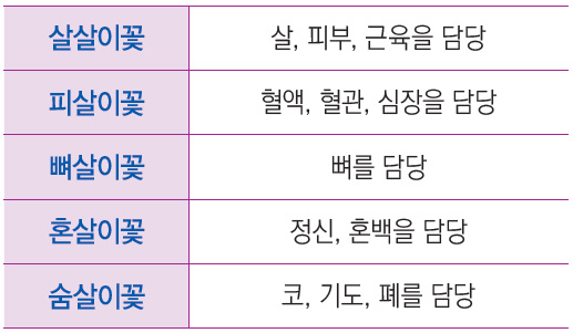 살살이꽃에는 살, 피부, 근육을 담당하는 꽃 요정이 있어요. 살살이꽃 담당 요정이 있는 거예요. 다음에 피살이꽃에서는 혈액, 혈관, 미세혈관까지 그리고 특히 심장을 담당하는 요정이 나옵니다. 뼈살이꽃에서 뼈 담당 요정이, 혼살이꽃에서 정신, 혼백 담당 요정이, 그리고 숨살이꽃에서 코, 기도, 폐를 담당하는 요정이 나옵니다.