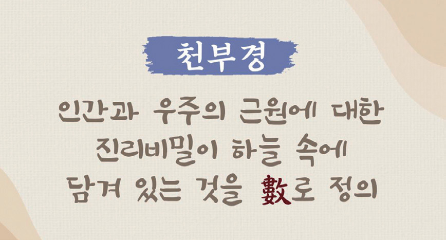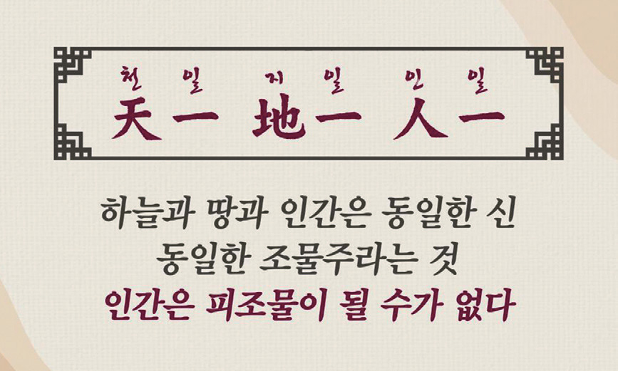 그런데 더 나아가서 인일人一은 다시 태일太一이라고 부연하여, 하늘 땅보다 더 높은 위격位格으로 올려놓고 있습니다. 신에 의해 창조되고, 신을 경배하고 신에게 순종하는 것을 인간 구원의 길로 여기는, 서양의 사유와는 완전히 다른 선언입니다. 오히려 신보다 더 존귀한 위격을 부여한 것입니다.