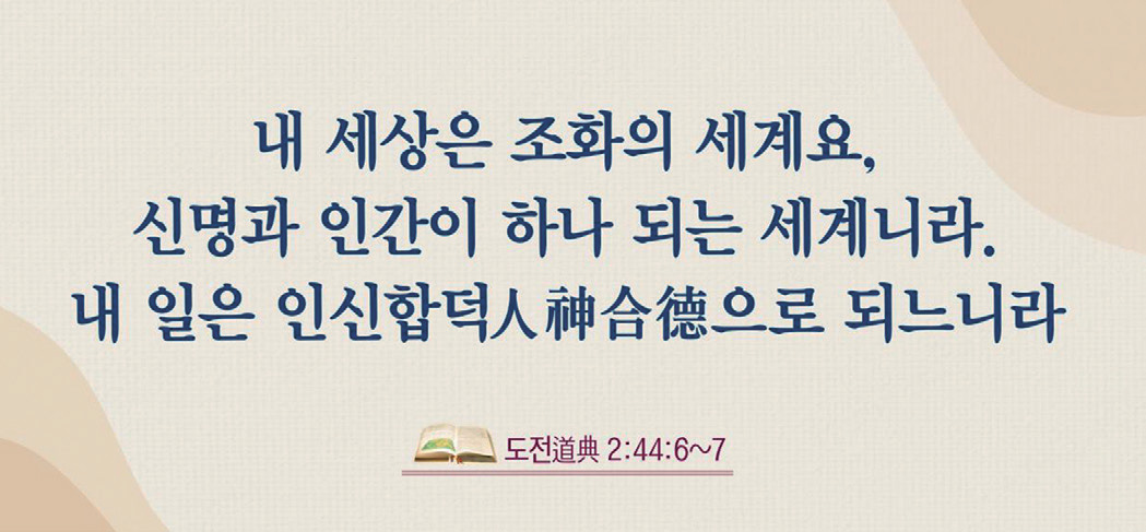 그렇게 가을 천지의 신인간으로 거듭나, 천지의 꿈과 이상理想을 실현하는 인존人尊의 삶을 사는 것! 이것이 이 시대를 사는 모든 인간 삶의 궁극 목적인 것입니다.