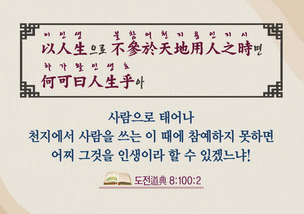 상제님께서는 “이인생以人生으로 불참어천지용인지시不參於天地用人之時면 하가왈인생호何可曰人生乎아! 사람으로 태어나 천지에서 사람을 쓰는 이때에 참예하지 못하면 어찌 그것을 인생이라 할 수 있겠느냐!”(도전道典 8:100)