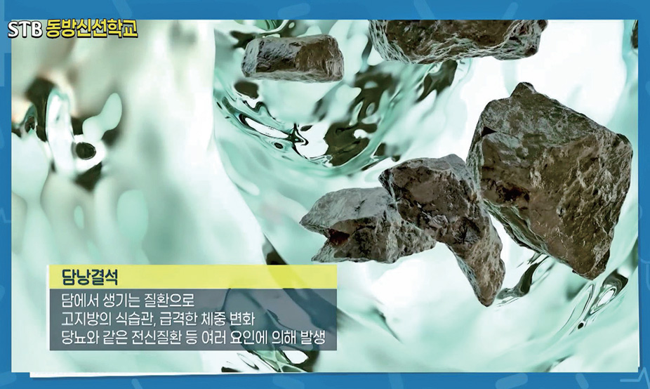쓸개즙이 쓸개에서 생성되는 것으로 아는 분들이 계실 겁니다. 그런데 실제로는 간에서 생성이 되고 쓸개에서 농축이 되어 분비됩니다. 이 쓸개즙이 분비됨으로써 지방의 소화를 돕죠. 담에서 생기는 질환으로는 #담낭결석#膽囊結石이 있는데요. 이러한 담석은 고지방의 식습관, 급격한 체중의 변화, 당뇨와 같은 전신 질환 등 여러 요인에 의해서 생기게 됩니다.