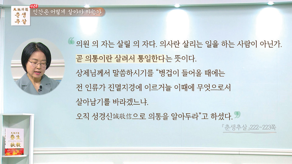 상제님께서 말씀하시기를 병겁이 들어올 때에는 전 인류가 진멸지경에 이르거늘 이때 무엇으로써 살아남기를 바라겠느냐. 오직 성경신誠敬信으로 의통을 알아두라고 하셨다. - 『천지의 도, 춘생추살』