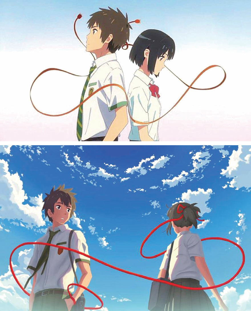 서로를 잇는 실에 대한 이야기는 일본의 애니메이션 영화 〈너의 이름은(君の名は)〉(2016, 한국은 2017년 개봉)과 많은 점에서 결을 같이하고 있어 여기 소개한다. 일본 최고의 애니메이션 감독으로 인정받는 신카이 마코토しんかい まこと(新海誠)가 만든 이 영화는 도쿄에 살고 있는 남자아이 타키와 시골에 살고 있는 여자아이 미츠하가 어느 날부터 서로 몸이 바뀌기 시작하면서 겪게 되는 이야기다.