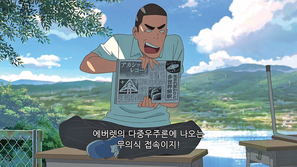 양자 얽힘은 두 개의 입자가 원거리에서 서로 상태를 공유하여, 한쪽을 관측하면 다른 쪽의 상태가 즉각적으로 결정되는 현상이다. 관측자가 어디에 있든, 한 입자의 상태 변화가 다른 입자에도 순간적으로 영향을 미치는 ‘비국소성(non-locality)’이 양자 얽힘의 핵심이다. 영화에서 미츠하와 타키는 서로 다른 시간과 공간에서 살아가면서도 영혼이 각자의 몸에 들어가 상대방의 일상을 경험하는데, 일종의 ‘정보 교류’를 이룬다. 영화 초반부 미츠하와 타키가 뒤바뀌는 걸 보고 미츠하의 친구인 텐시가 과학 잡지를 읽으며 “에버렛 해석에 근거한 평행 우주에 무의식이 접속한 것일지도!”라고 말하는데, 이 대사는 그저 뚱딴지같은 소리가 아니라 실제로 제기되었던 물리학 이론에 근거한 말이다.