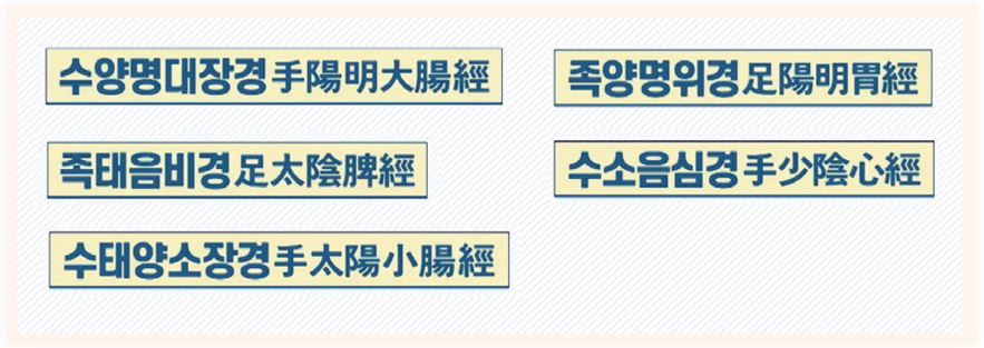 두 번째 시간인데요. 지난 시간에 12경맥의 수태음폐경手太陰肺經에 대해 알아보았습니다. 오늘은 수양명대장경手陽明大腸經, 족양명위경足陽明胃經, 족태음비경足太陰脾經, 수소음심경手少陰心經, 수태양소장경手太陽小腸經에 대해 알아보겠습니다.