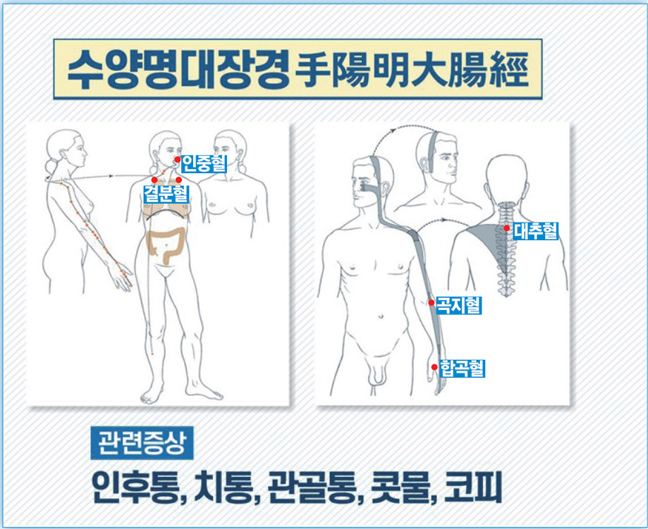 먼저 수양명대장경手陽明大腸經인데요. 수양명대장경은 둘째손가락 끝에서 시작하여 손가락 위쪽을 지나 엄지와 검지의 뼈 사이 합곡혈合谷穴로 나옵니다. 이후 아래팔 위쪽을 따라 올라가며 팔꿈치 바깥쪽 주름이 끝나는 곳인 곡지혈曲池穴을 지난 후 위팔의 바깥쪽으로 올라가 어깨 관절의 앞쪽으로 나오게 됩니다. 여기서 독맥의 대추혈大椎穴로 한 번 돌아오고 쇄골 부위 결분혈缺盆穴에서 두 갈래로 갈라지는데 아래쪽 줄기는 폐에 이어지고, 횡격막 아래로 내려가 대장에 닿게 되고, 위로 올라가는 줄기는 목 앞쪽으로 올라가 뺨을 뚫고 아랫니의 가운데로 들어간 후 입을 따라 돌아 나와 인중혈人中穴에서 좌우로 교차한 다음 콧구멍 옆으로 올라갑니다.