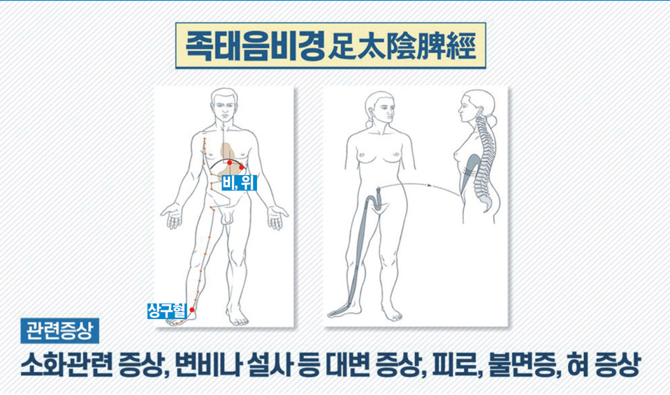 다음은 족태음비경足太陰脾經입니다. 족태음비경은 엄지발가락 끝에서 일어나 발가락 안쪽를 따라 올라와 안쪽 복숭아뼈 앞의 상구혈商丘穴로 올라옵니다. 이후 종아리 안쪽으로 올라와 경골 뒤에서 족궐음간경足厥陰肝經과 교차하며 앞으로 나온 후 무릎과 넓적다리의 안쪽 앞 모서리를 따라 올라와 배 속으로 들어가 비脾에 닿고 위胃에 이어집니다. 여기서 두 갈래 줄기가 나와 한 줄기는 올라와 목구멍을 따라가다가 혀에 이어지고 한 줄기는 횡격막 위로 올라가 심장으로 갑니다.
