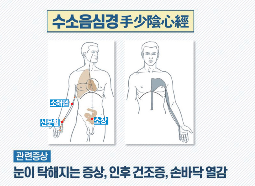 수소음심경에서 중요한 내용은 심장과 눈이 연결되어 있다는 것인데요. 우리는 주로 눈을 통해 현실을 인식합니다. 한의학에서는 심주신心主神이라 하여 우리가 현실을 인식하고 사고하는 의식 작용을 심장의 역할로 설명하였습니다. 실제로 편하게 앉거나 누워서 눈만 감아도 심장이 안정되는 것을 느낄 수 있죠.
