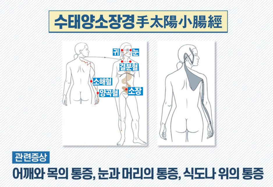 다음은 수태양소장경手太陽小腸經입니다. 수태양소장경은 새끼손가락 바깥쪽 끝에서 일어나 손의 바깥쪽을 따라가다가 손목으로 올라와 척골의 양곡혈陽谷穴로 나오고요. 이후 아래팔의 척골 아래쪽으로 따라 올라와 팔꿈치 끝과 안쪽 뼈 사이의 소해혈로 나옵니다. 위팔의 바깥쪽 뒤를 따라 올라 어깨관절로 나와 견갑골을 둘러 가다가 어깨 위에서 교차하며 쇄골의 결분혈로 들어갑니다. 여기서 갈라지는데 한 줄기는 내려가 심장에 이어지고, 횡격막 아래로 위胃에 도달하고 소장에 닿습니다. 한 줄기는 쇄골에서 목을 관통하여 올라가는데 뺨에서 또 갈라져 한 줄기는 눈으로 갔다가 귓속으로 들어가고, 다른 줄기는 코뼈로 올라가 코를 지나 눈 안쪽 구석에 도달합니다.