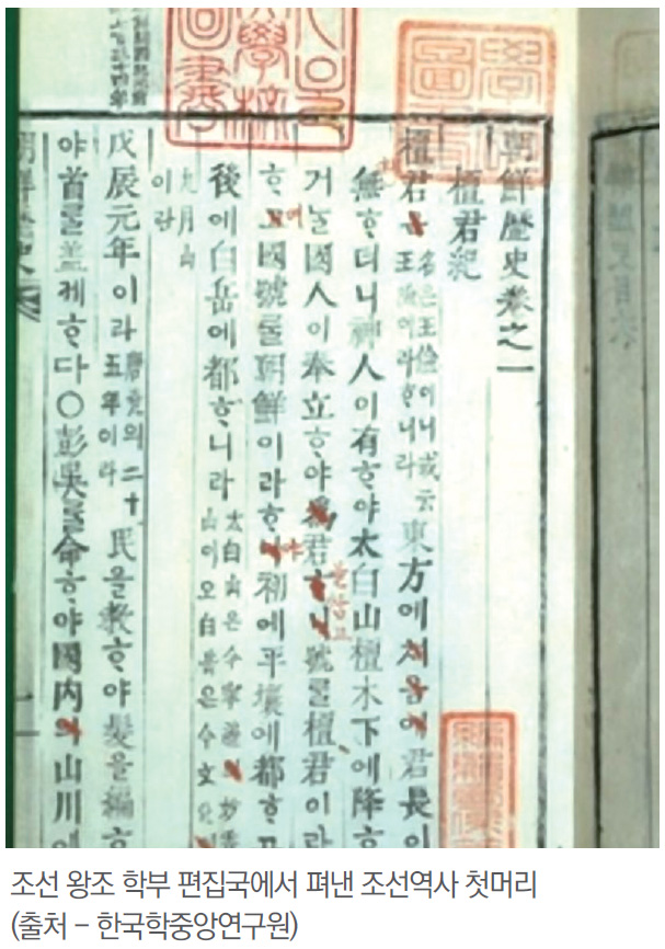 국조國祖로부터 당대사當代史까지 서술한 역사 교과서의 시작은 1895년(고종 32년) 조선 왕조 학부 편집국에서 만든 최초의 소학교용 국사 교과서인 『조선역사朝鮮歷史』일 것이다. 체계나 내용 면에서 여러 문제점은 있지만, 시작을 일단 단군조선부터 확실히 서술해 계통을 명확히 했다. 즉 국통 맥國統脈을 잡아 주고 있다. ‘대조선 개국 기원전 3734년’이라 표기하고 있다. 지금처럼 신화라거나 “건국했다고 한다.”라는 식의 두루뭉술한 서술이 아니다.