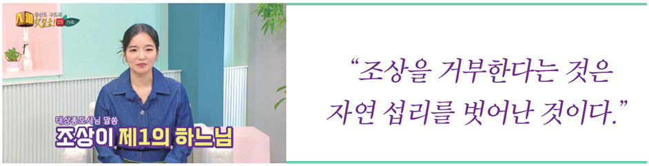 참하느님이신 상제님께서도 친히 “조상은 아니 위하고 나를 위한다 함은 부당하나니, 조상의 제사를 극진히 받들라.”라고 하셨고, 태상종도사님께서는 “조상이 제1의 하느님”이라는 말씀을 거듭 전해 주셨습니다. 사람이 천지부모인 하늘과 땅의 꿈을 이루는 진정한 인간 열매로 거듭나기 위해서는 제일 먼저 자신의 뿌리인 조상님을 찾고, 제대로 모셔야 한다는 말씀인데요, 김 도생님은 그 말씀에 큰 감명을 받으신 것 같습니다.