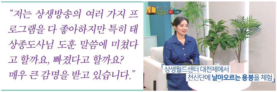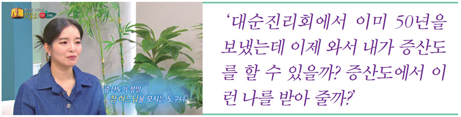 그 일이 있고 1년쯤 지났을 떄 하루는 시당고모님이 찾아와 “우리 며느리가 대순진리회를 다닌다.”라고 하셨습니다. 머지않아 그 며느리가 시당고모님과 함께 찾아와 제게 대순진리회는 조상을 모시는 절이라고 소개했습니다. 그분에게 조상님에 대한 얘기를 듣고 대순진리회를 다니기로 했습니다. 그 후 50년이 흐른 어느 날, 대순진리회에 함께 다니던 저와 친한 분이 제게 상생방송을 한번 보라고 권하였습니다. 이유인즉, 얼마 전 방에서 상생방송을 보고 있던 간부를 봤는데 그분이 TV를 끄더니 집에 가서 상생방송을 한번 시청해 보라고 말했다는 겁니다.