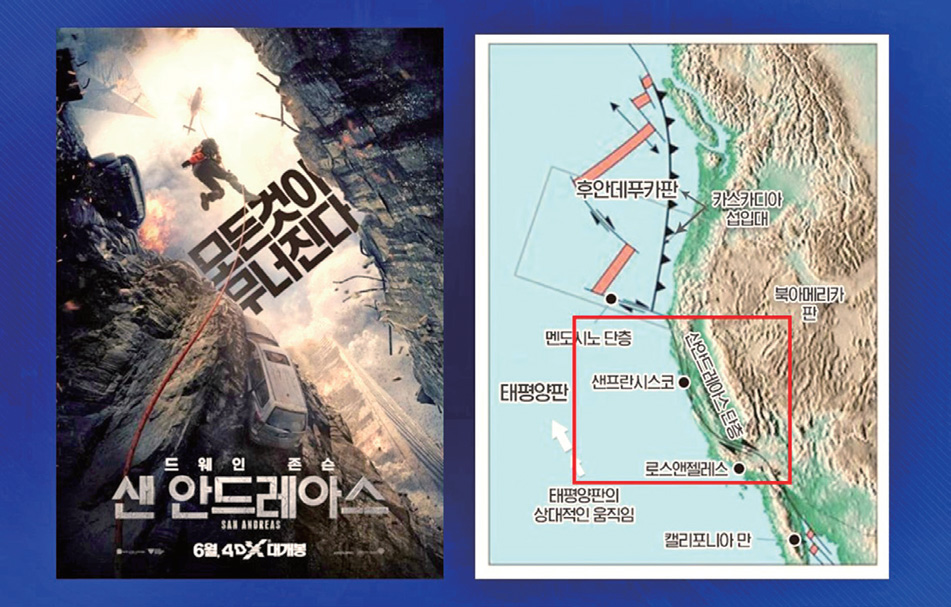 2015년 개봉된 미국 영화 〈샌 안드레아스San Andreas〉가 있었죠. 캘리포니아 남부에 있는 샌 안드레아스 단층이 끊어지면서 연쇄적으로 대지진이 발생해 엄청난 재앙이 닥친다는 영화입니다.