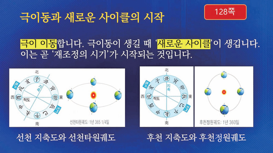 1936년부터 이미 지각 자체가 변화하고 있는데, 지구 회전축의 변화는 쉽게 말해 기울어져 있는 지축地軸이 선다는 것이죠. 동시에 타원楕圓을 그리는 공전公轉의 궤도가 ‘정원正圓 궤도’로 변하는 현상이 일어납니다.