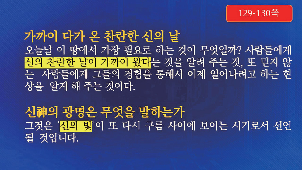 129쪽과 130쪽에서는 ‘가까이 다가온 찬란한 신’에 대해 설명하고 있습니다. 에드가 케이시는 앞서 엄청난 대변화와 많은 사람들이 죽을 것 같은 상황을 언급했지만, 이는 종말이 아니라 개벽이라고 강조합니다. 대변혁 이후에는 지금의 삶과는 근본적으로 다른 새로운 시대가 기다리고 있다는 것이 중요한 메시지입니다.