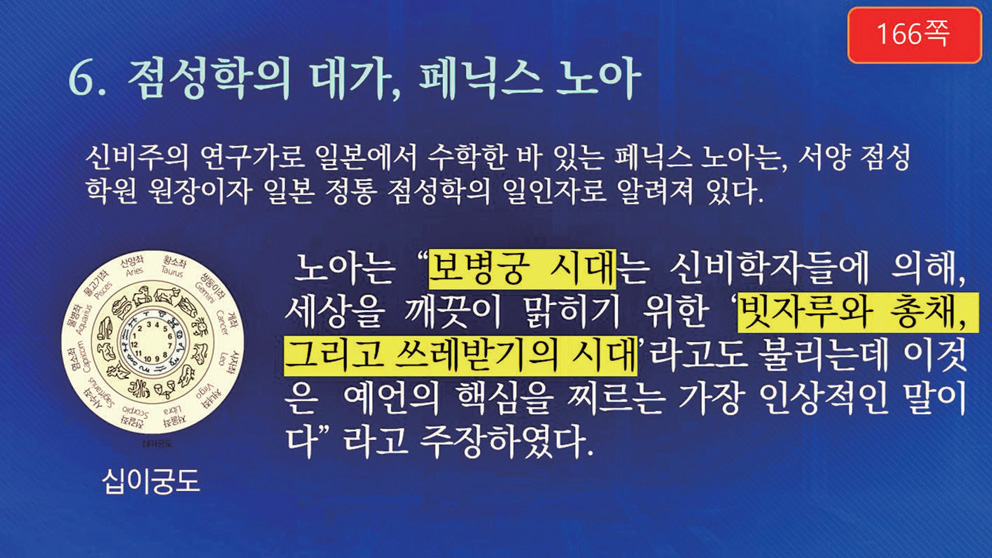 “보병궁 시대는 신비학자들에 의해, 세상을 깨끗이 맑히기 위한 ‘빗자루와 총채(먼지떨이), 그리고 쓰레받기의 시대’라고도 불리는데 이것은 예언의 핵심을 찌르는 가장 인상적인 말이다.”
