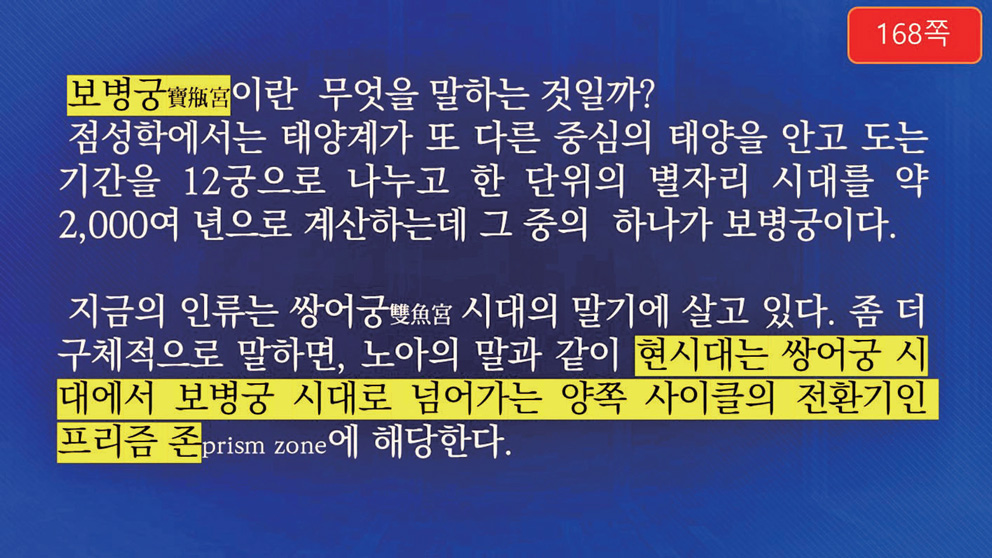 보병궁寶甁宮(물병자리, Aquarius)이라는 것은 천구天球상에 태양이 지나가는 길을 뜻하는 황도黃道 십이궁 중 열한 번째 별자리를 말합니다. 태양계가 중심 태양을 향해 돌고 있는 것을 12궁宮으로 나눠서 한 궁을 2천 년 정도로 계산하는데 그중 하나입니다. 지금은 쌍어궁 시대의 말기에 살고 있고 그다음에 물병자리, 보병궁 시대로 넘어갑니다. 현시대는 쌍어궁 시대에서 보병궁 시대로 넘어가는 양쪽 사이클의 전환기인 프리즘 존prism zone에 해당된다고 합니다. 선후천의 교차기를 얘기하는 것입니다.