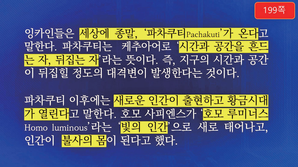 잉카인들은 세상에 종말, ‘파차쿠티Pachakuti’가 온다고 말하는데, 이것은 ‘시간과 공간을 흔드는 자, 뒤집는 자’라는 의미입니다.『증산도의 진리』 책 제4장을 보면 “천지개벽天地開闢이라는 것은 천지일월天地日月의 대변국 작용이며 시간時間과 공간空間의 대전환 운동”이라는 문구가 나옵니다. 시간과 공간을 뒤흔드는 자, 뒤집는 자, 개벽이라는 뜻이죠. 지구의 시간과 공간이 뒤집힐 정도의 대격변이 발생한다는 것입니다.